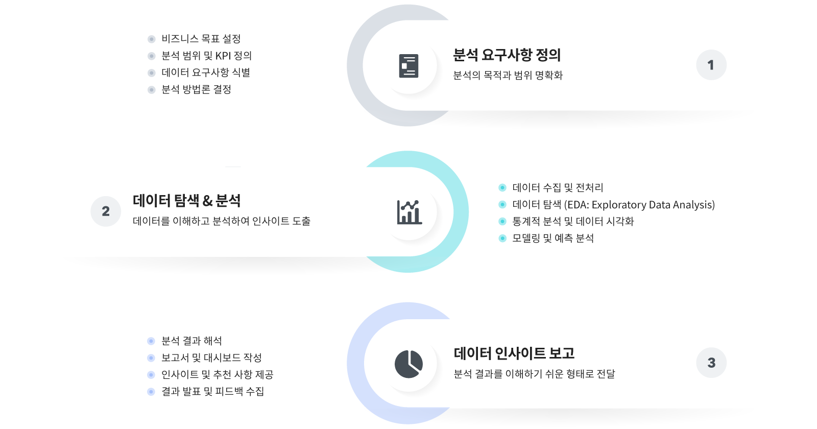 고객의 비즈니스 목표와 상황에 맞춘 데이터 분석 서비스는 고객의 당면한 과제와 요구를 깊이 이해하고, 그에 최적화된 데이터 인사이트를 도출해 냅니다.