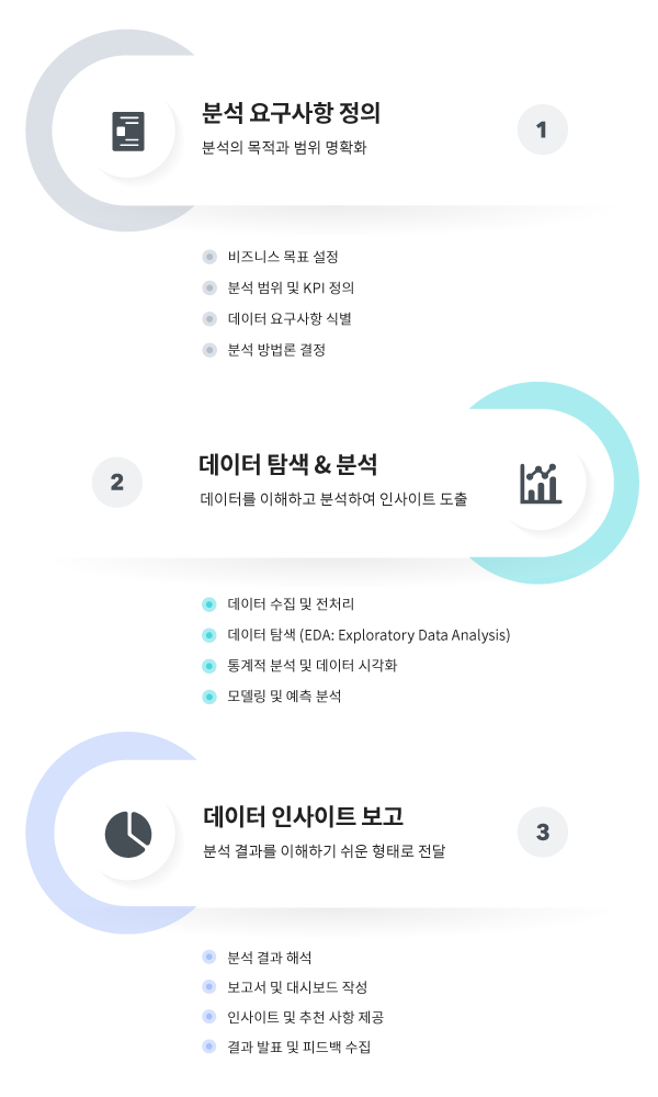 고객의 비즈니스 목표와 상황에 맞춘 데이터 분석 서비스는 고객의 당면한 과제와 요구를 깊이 이해하고, 그에 최적화된 데이터 인사이트를 도출해 냅니다.
