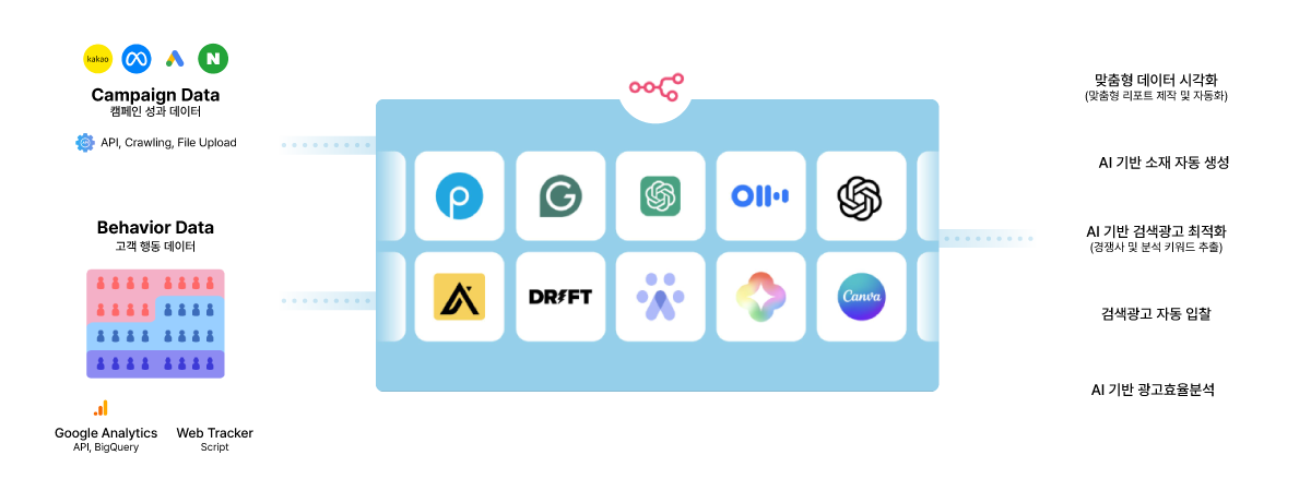 - Meta, Google Ads, Naver 등 광고 플랫폼과의 API 연동