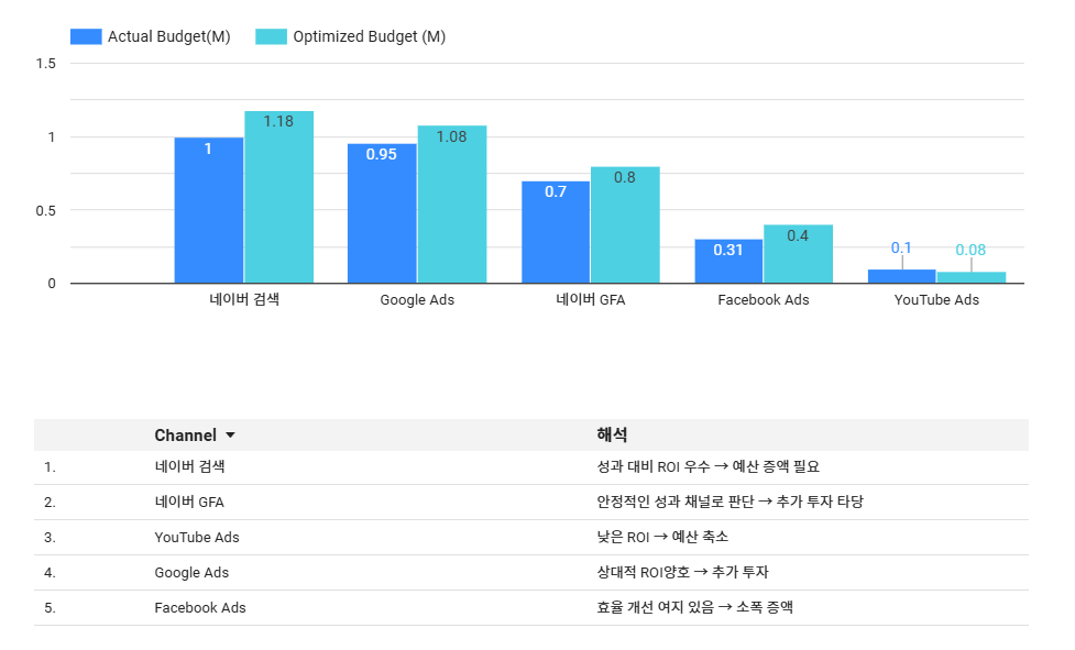 | Week 5~6 | 예산 재배분 시뮬레이션 및 반응곡선 분석 |